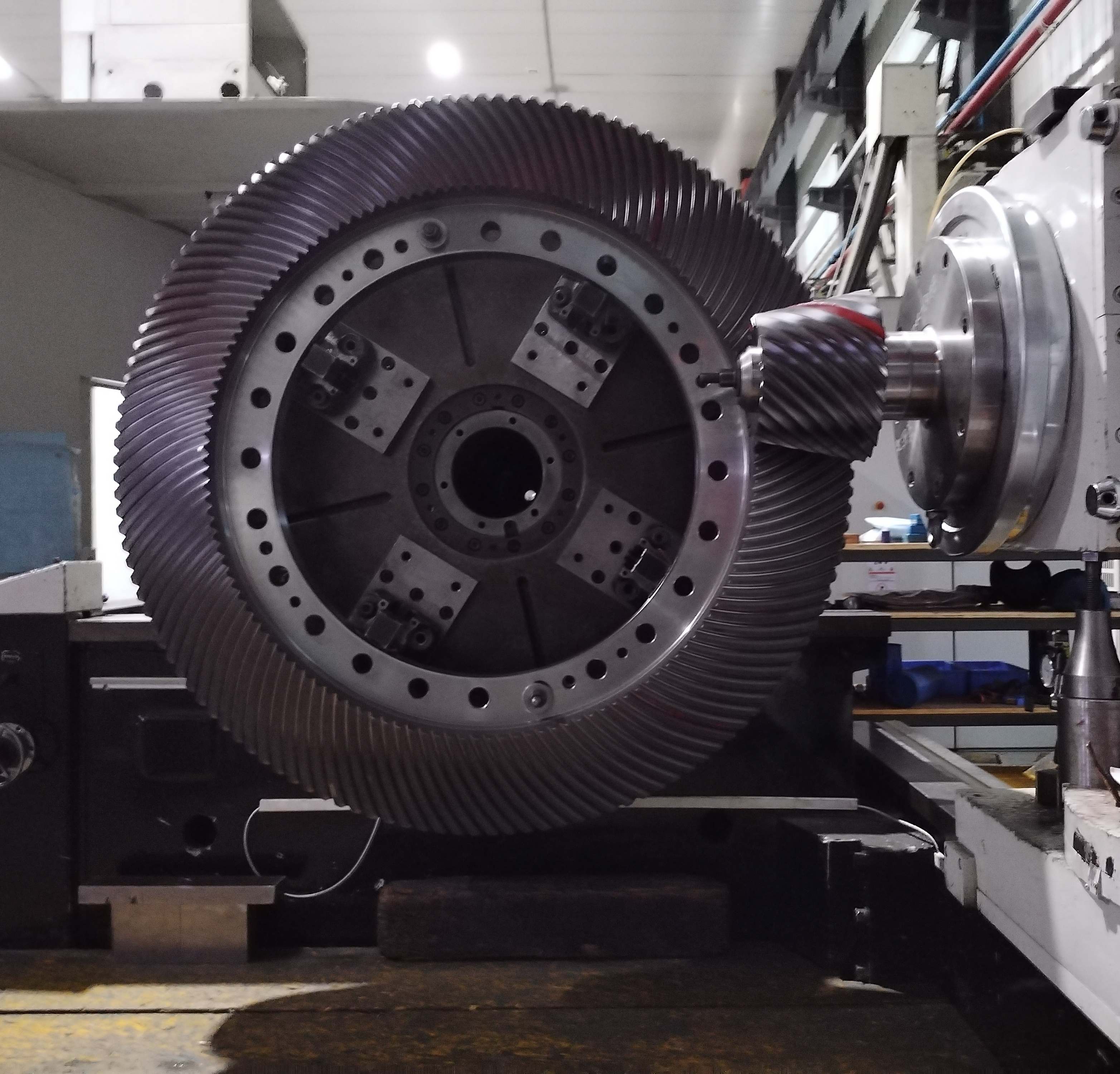 該齒輪直徑1450mm, 采用準(zhǔn)雙曲面齒制。為了降低噪音,采用加大齒寬、大偏置距設(shè)計,增加了重合度。錐齒輪并非越寬越好,為了解決加大齒寬帶來的加工、嚙合等問題,對齒輪副采取LTCA分析,對系統(tǒng)用Romax進(jìn)行動力學(xué)分析,同時利用滾檢著色進(jìn)行修形反調(diào)等技術(shù),保證傳動嚙合的可靠性。該項(xiàng)目的成果研制,代表著我司錐齒輪設(shè)計、加工技術(shù)進(jìn)入了深入研究的階段。為大偏置距大尺寸準(zhǔn)雙曲面齒輪加工奠定了基礎(chǔ),也為超齒寬低噪聲錐齒輪的應(yīng)用積累了設(shè)計和加工經(jīng)驗(yàn)。